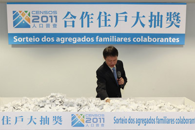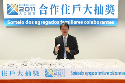 Data collection for 2011 Census has successfully concluded. As a token of appreciation from the Statistics and Census Service (DSEC), upon completion of the Census questionnaire, the households were automatically entered into the Cooperating Households Lucky Draw. The draw was held on 14 October, conducted by Ieong Meng Chao, Acting Director of DSEC, Cheng I Wan, Deputy Director, and other DSEC officials. A total of 53 winning households are announced as follows: