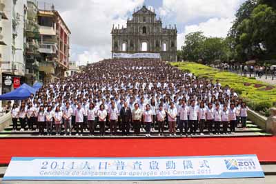 2011人口普查為期15天的資料收集工作正式展開,在代理行政長官陳麗敏及經濟財政司譚伯源司長見證下,統計暨普查局局長鄺碧芳帶領近2000名普查工作人員齊集大三巴牌坊一同宣誓:盡忠職守完成2011人口普查工作,並嚴格遵守統計保密法例的規定。