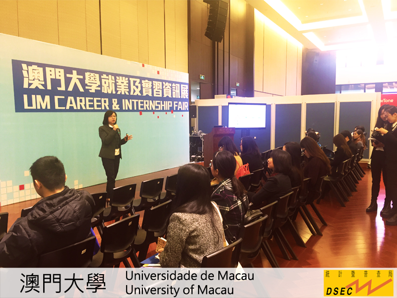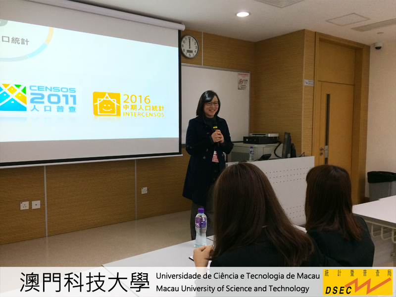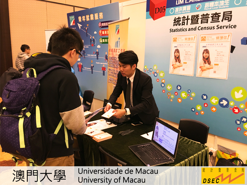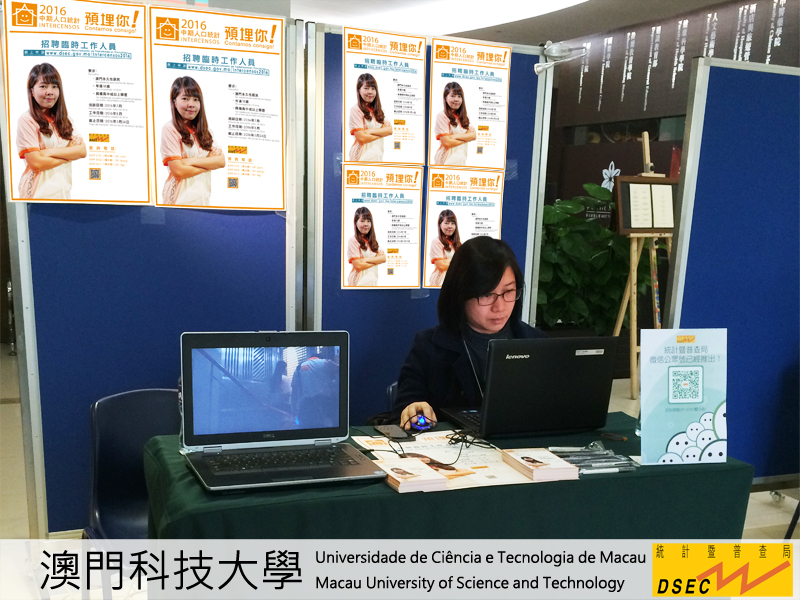 於今年3月,本局參與澳門大學及科技大學舉辦的招聘會及進行講座,介紹2016中期人口統計,並鼓勵學生積極參與中期人口統計工作。